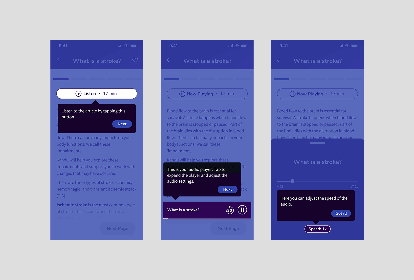 I also added an interactive first time experience for audio learning. In this I made sure to introduce the speed adjustment option, as a function that is particularly useful for stroke survivors and that was not known functionality based on our user surveys.