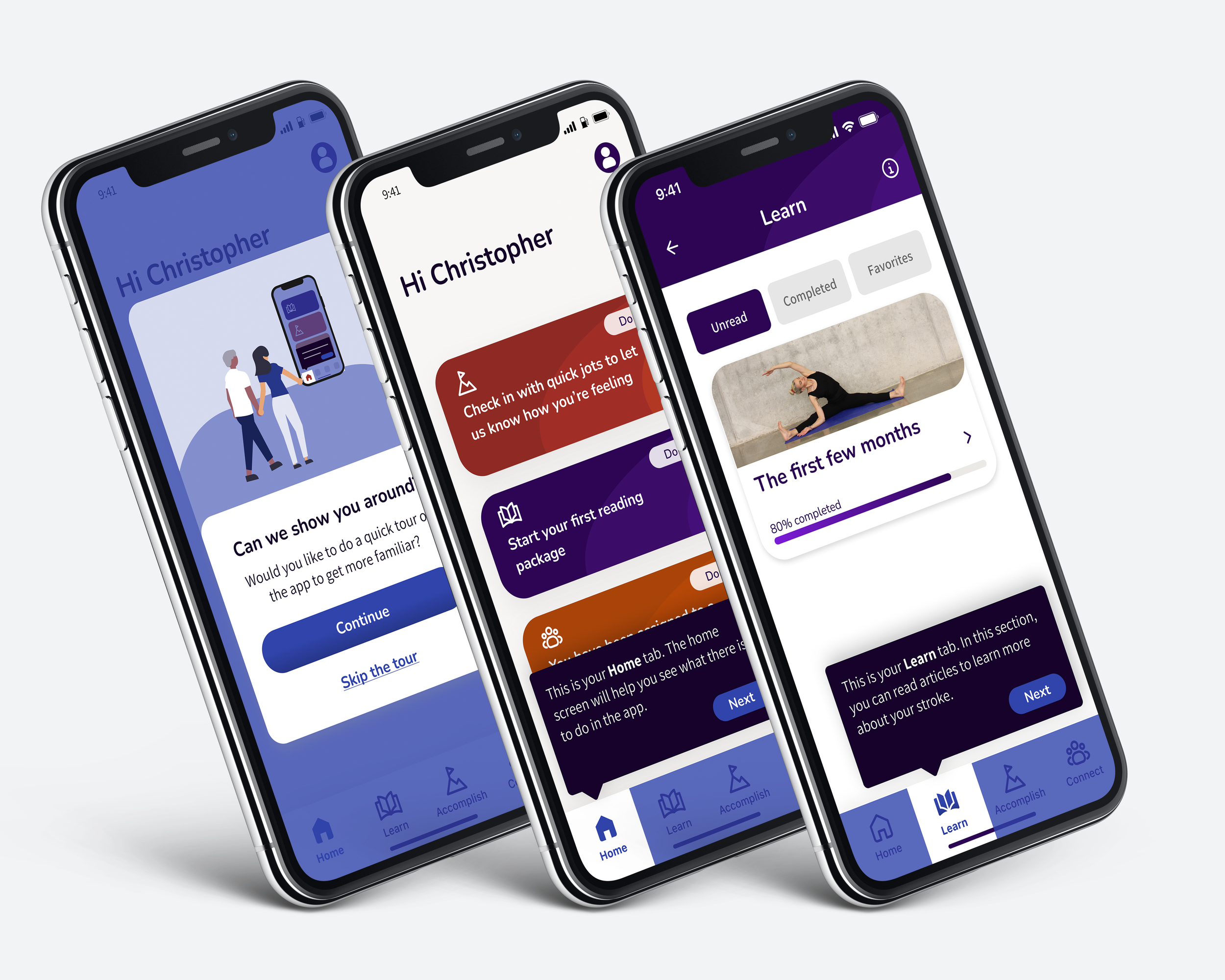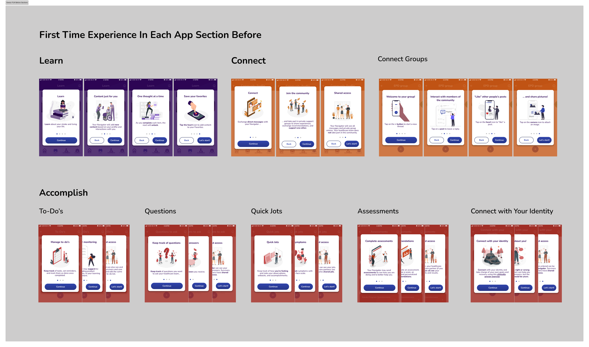 The Accomplish section houses a number of tools to help survivors manage their post stroke recovery (Quick Jots, Questions, To-Do’s, Assessments, and Connect with your Identity). In the original experience, each of these sections started with a series of introduction modals.