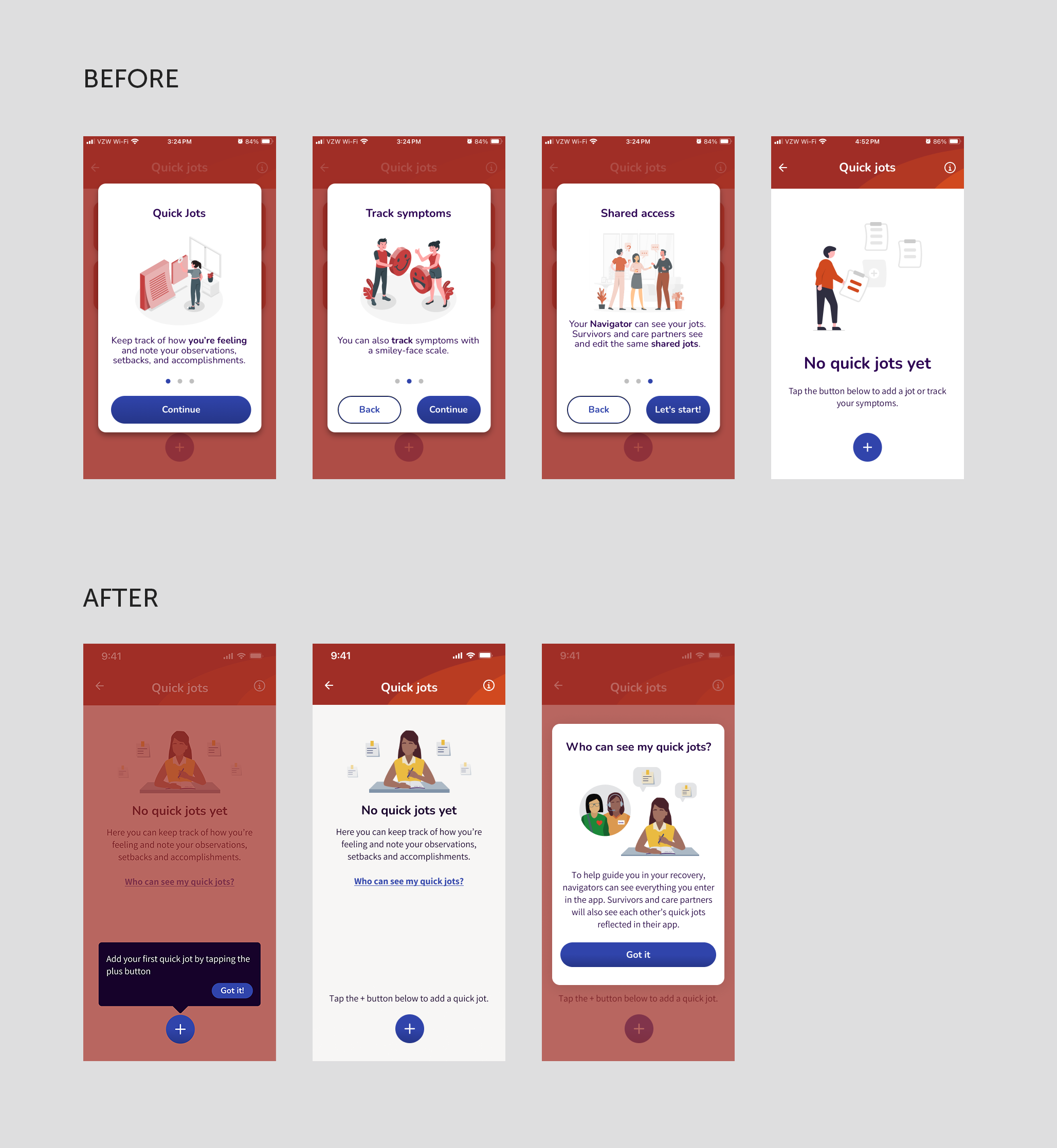 For the new experience, I moved text from modals into the empty states, to get the user into the section quicker. The shared information modal became a link to a modal from the empty state, to let the user ask the question vs showing up front as a blocker to the section. For the introduction to adding (adding a quick jot, question, or to-do), I added a tooltip pointing directly to the add button.