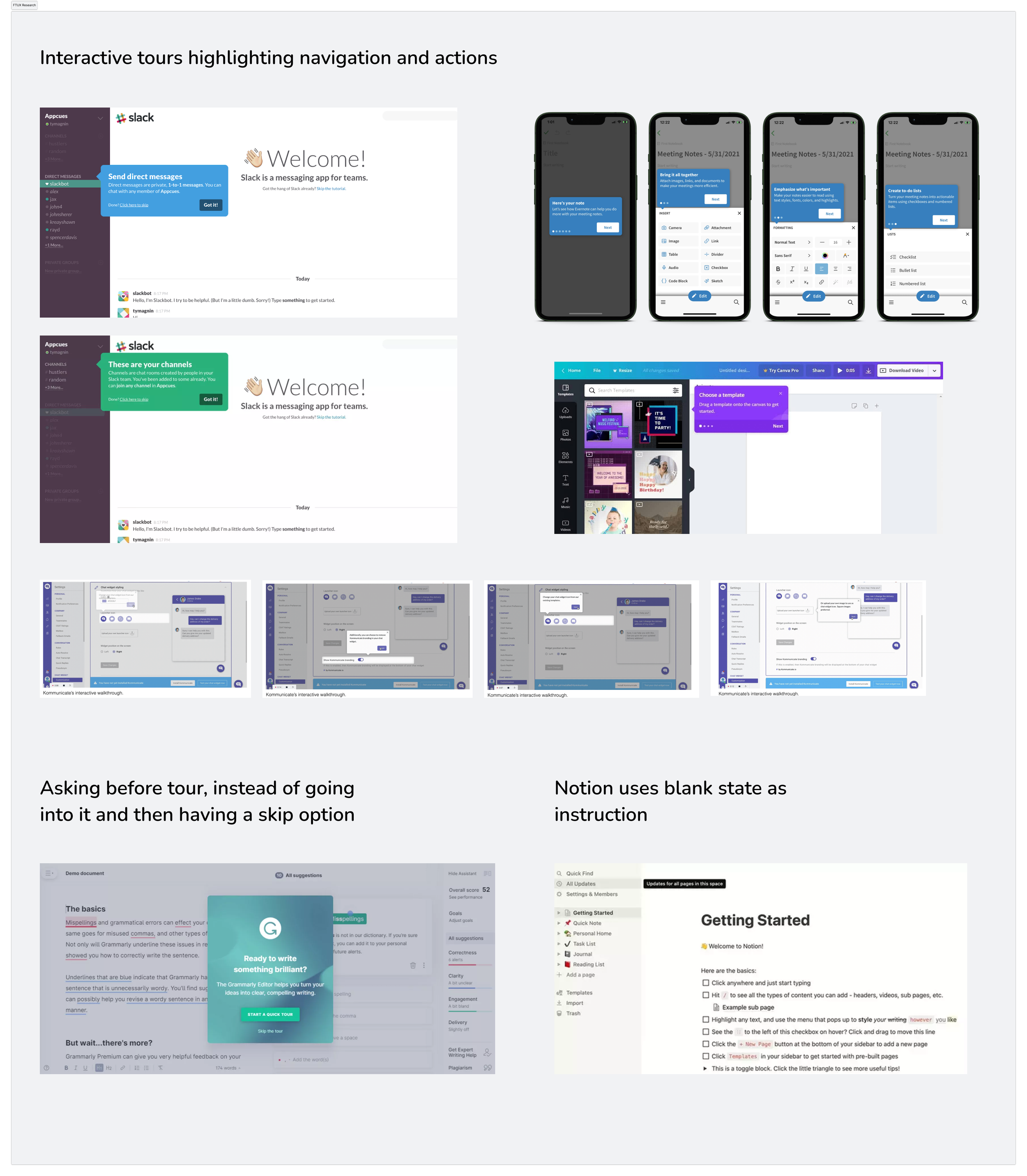 Having a user validated direction, I did research on other first time user experiences & product tours, identifying effective patterns for a more interactive first time experience.