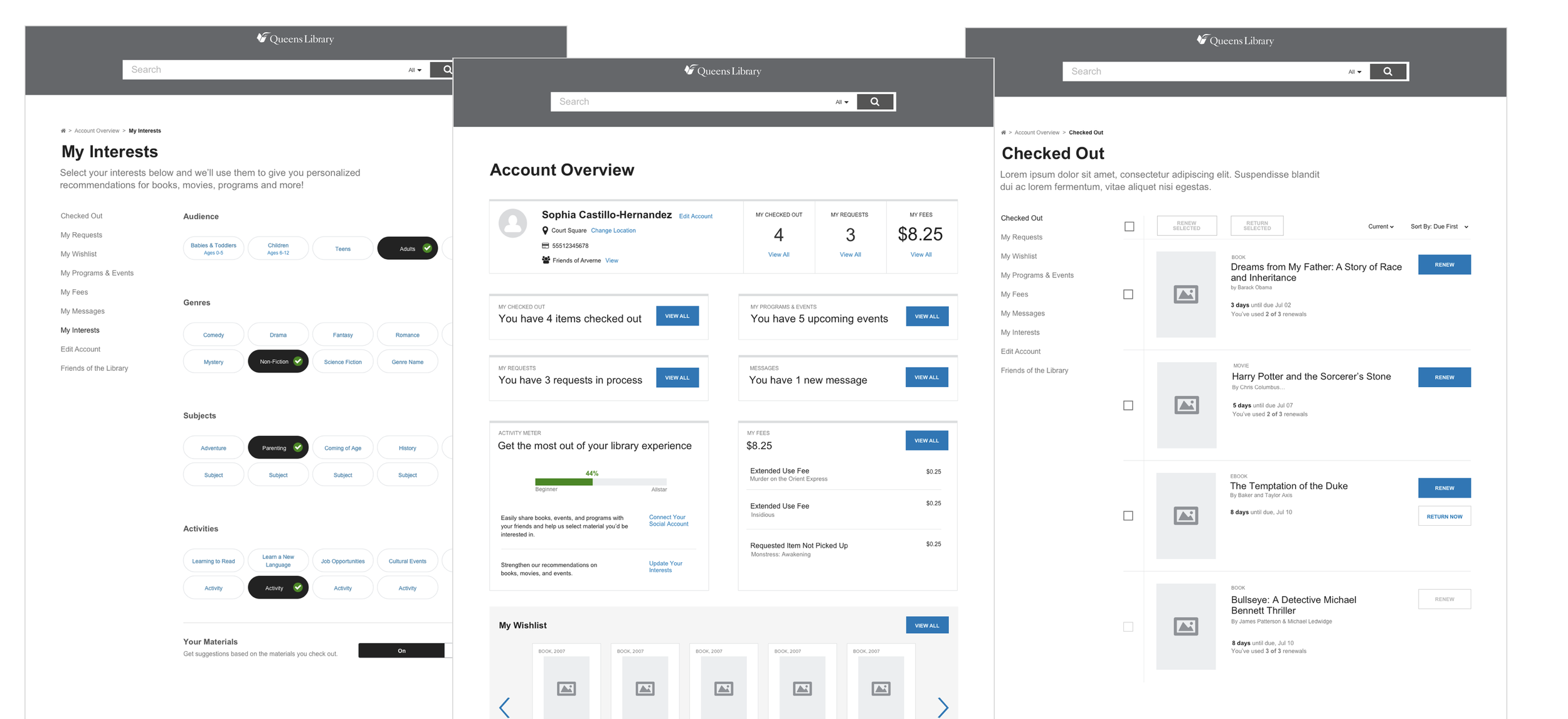 In the account, users could manage checked out and requested materials, fees, and events. They could also personalize their interests to generate recommendations.