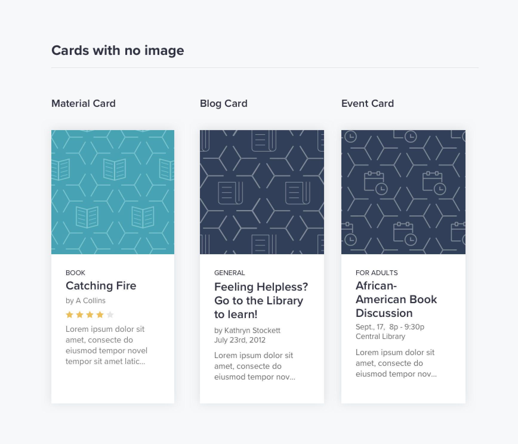 To unify content across the site, I developed a set of scalable patterns used for materials, events, and blog entries. These patterns not only created visual consistency but also served as dynamic placeholders for missing images, adding a layer of branding and personality.